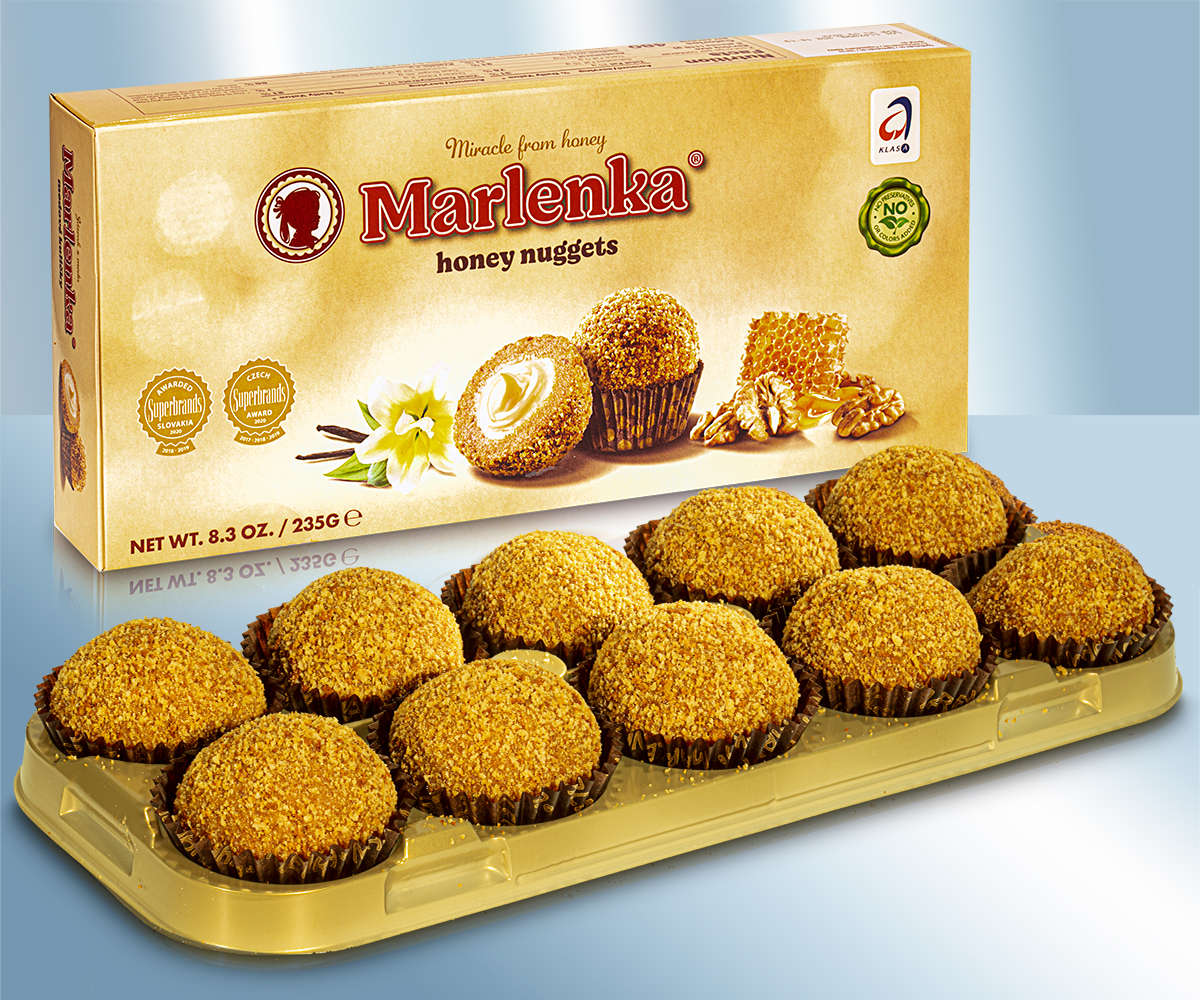 Caramelos en forma de bola con relleno (15%), miel (3%) y nueces (2%). Ingredientes: Leche condensada azucarada con cacao (leche, azúcar, jarabe de glucosa, cacao en polvo bajo en grasa), margarina (aceite de palma, agua potable, aceite de coco totalmente hidrogenado, aceite de colza, emulgente: (E471, E322), sal de mesa, regulador de acidez: (E330), aroma), harina de trigo enriquecida (harina de trigo, fumarato de hierro, vitamina B5, ácido fólico, vitamina B1, vitamina B2), azúcar, huevo en polvo, miel, nueces, crema vegetal batida (azúcar, grasas y aceites vegetales (palmiste, palma, manteca de karité), leche desnatada en polvo, producto de suero de leche, emulgente: (E476, lecitina, (soja)), aroma), agua potable, aceite de colza, polvo para hornear: (E500), jarabe de caramelo, almidón de trigo, aroma natural (nuez), yema de huevo deshidratada, crema batida (almidón de trigo, aceite de colza, aceite de palma, huevo en polvo, almidón de maíz, jarabe de almidón, Proteína, levadura química (E500, E339), proteínas de la leche, sal de mesa), vinagre de esencia de vinagre, sal de mesa, aroma, yema de huevo deshidratada, corrector de acidez (E330), aroma natural de vainilla, especias. Envasado en atmósfera protectora. Precaución: El envase contiene una bolsa con desecantes. No es comestible. Por lo tanto, tras abrir el envase, la bolsa debe desecharse en la basura. A ≤ 24 °C. Consumir preferentemente antes del: ver campo blanco. Distribución: MARLENKA international s. r. o., Valcířská 434, 738 01 Frýdek-Místek, República Checa. Valor nutricional por 100 g: Valor energético: 1713 kJ / 409 kcal, Grasas: 21 g, de las cuales saturadas: 13 g, Hidratos de carbono: 49 g, de los cuales azúcares: 38 g, Proteínas: 6,2 g, Sal: 0,55 g,