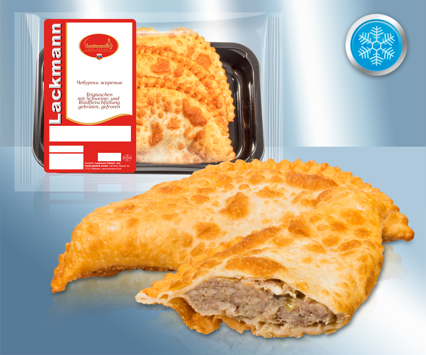 Chebureki frito con relleno (50 %) de cerdo y ternera, congelado.