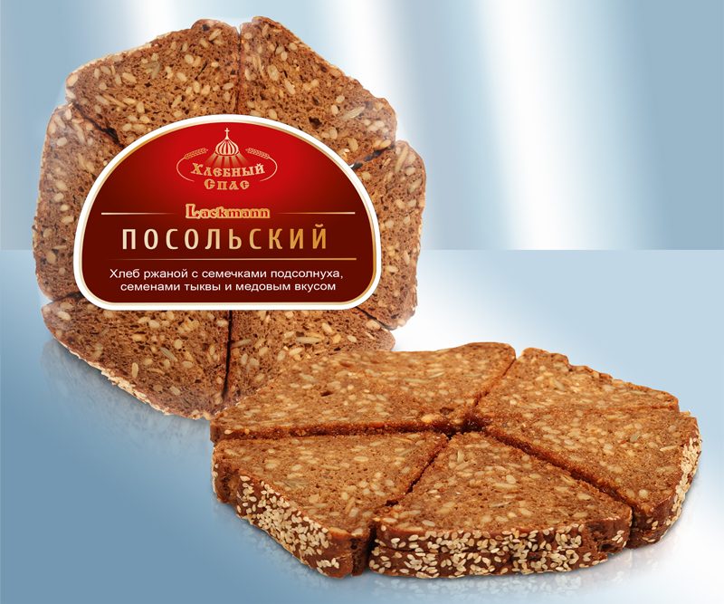 Pan de centeno "Posolsky" con pipas de girasol, pipas de calabaza y sabor a miel, rebanado, congelado. Ingredientes: harina 53% (harina de centeno 66%, harina de trigo), pipas de girasol 23%, agua potable, concentrado de mosto de kvas (harina de centeno, malta de centeno, malta de cebada), pipas de calabaza 6%, malta de centeno en polvo, sal yodada (sal de mesa, yoduro de potasio), levadura, sésamo, azúcar, gluten de trigo, correctores de acidez (E330, E500), aroma. No volver a congelar el producto descongelado. Distribución: Lackmann Fleisch- und Feinkostfabrik GmbH, Carl Benz Straße 10, 77731 Willstätt, Alemania. El producto sin abrir debe conservarse entre -25 °C y -18 °C y consumirse antes de: Información nutricional por 100 g: Energía: 665 kJ / 159 kcal, Grasas: 1,3 g, de las cuales saturadas: 1,1 g, Hidratos de carbono: 32 g, de los cuales azúcares: 0,7 g, Proteínas: 5,2 g, Sal: 1,2 g,