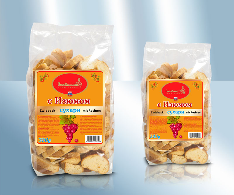 Bizcochos con pasas. Ingredientes: harina de trigo,azúcar, pasas 8%, agua, levadura, grasas y aceites vegetales (karité, palma), sal. Puede contener: huevos,leche,soja,mostaza,cacahuetes,sésamo. Conservar en un lugar fresco y seco. Distribución: Lackmann Fleisch- und Feinkostfabrik GmbH, Carl Benz Straße 10, 77731 Willstätt, Alemania. Consumir preferentemente antes del: ver el impreso del envase. Ver la parte superior del anverso. Valor nutricional por 100 g: Valor energético: 1677 kJ / 395 kcal, Grasas: 3,5 g, de las cuales saturadas: 1,3 g, Hidratos de carbono: 80 g, de los cuales azúcares: 19 g, Proteínas: 11 g, Sal: 0,80 g,