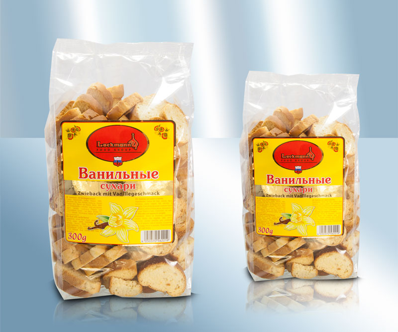 Bizcochos con sabor a vainilla. Ingredientes: harina de trigo,azúcar,agua,levadura,grasas vegetales (karité, palma),sal,sabor a vainilla,cúrcuma. Puede contener: huevos,cacahuetes,frutos secos,leche,soja,mostaza,sésamo.Conservar en un lugar fresco y seco. Distribución: Lackmann Fleisch- und Feinkostfabrik GmbH, Carl Benz Straße 10, 77731 Willstätt, Alemania. Consumir preferentemente antes de: ver el pie de imprenta. Valor nutricional por 100 g: Valor energético: 1666 kJ / 393 kcal, Grasas: 3,6 g, de las cuales saturadas: 1,3 g, Hidratos de carbono: 79 g, de los cuales azúcares: 18 g, Proteínas: 11 g, Sal: 0,90 g,