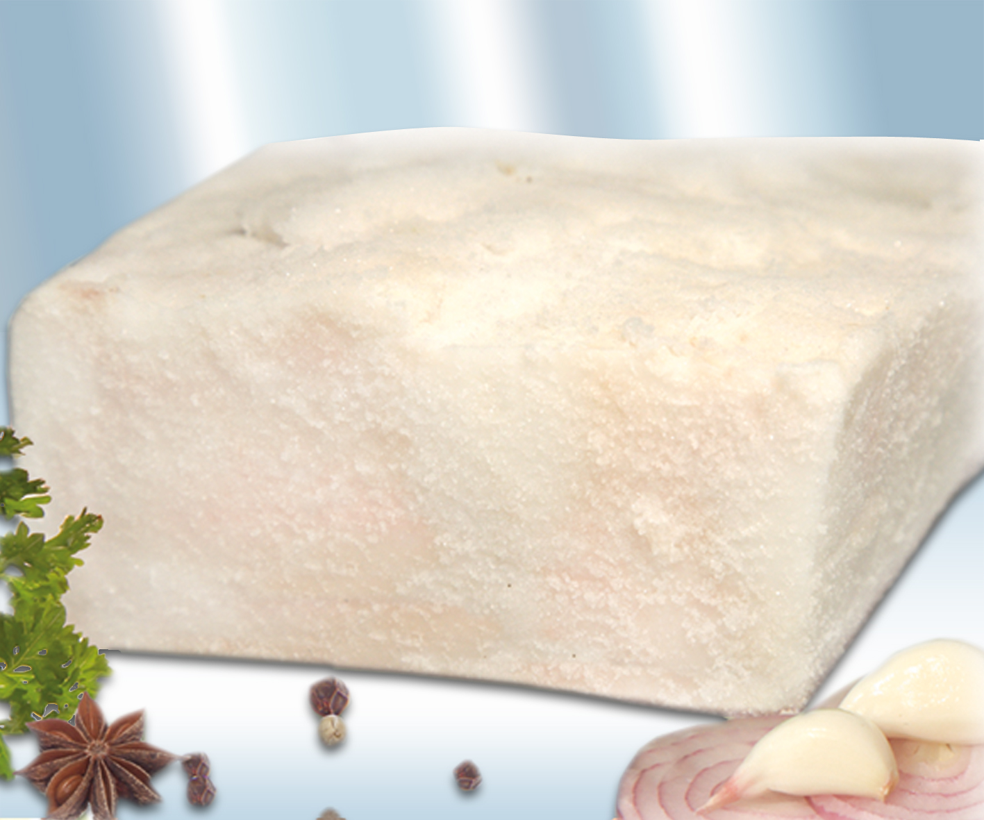 Хребтовый шпик соленый. Состав: сало свиной спинки, поваренная соль, cпеции, декстроза, сушеная глюкозная патока, антиоксиданты: аскорбат натрия. Пищевая ценность на 100g: Энергетическая ценность: 3359 kJ / 817 kcal, Жиры: 90g, - из них насыщенных жирных кислот: 38g, Углеводы: 1,0g, - из них сахара: <0,5g, Белки: 0,7g, Соль: 1,7g,