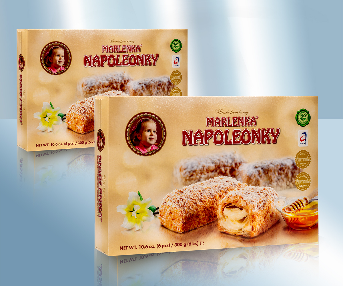 Кондитерское изделие с кремовой начинкой (40%) с медом (0,3%). . Состав: маргарин (пальмовое масло, питьевая вода, кокосовое масло полностью гидрогенизированные, рапсовое масло, Эмульгатор: (E471, E322), пищевая соль, pегулятор кислотности: E330, ароматизатор), сгущенное молоко с сахаром (молоко, сахар, крахмальная патока), обогащённая пшеничная мука (пшеничная мука, фумарат железа, витамин B5, фолиевая кислота, витамин B1, витамин B2), питьевая вода, сахар, сухой яичный желток, мед, уксус, пищевая соль, ароматизатор, натуральный ванильный аромат, Эмульгатор: (лецитин соя). Данный продукт может содержать следы: грецкие орехи. Упаковано в защитной среде. Внимание: упаковка содержит мешочек с влагопоглощающими веществами. Он НЕСЪЕДОБEH. Поэтому после вскрытия упаковки мешочек следует выбросить в мусор. При ≤ 8 °C употребить до: см. белое поле. Сбыт: MARLENKA international s. r. o., Valcířská 434, 738 01 Frýdek-Místek, Czech Republic. Пищевая ценность на 100g: Энергетическая ценность: 2126 kJ / 508 kcal, Жиры: 35g, - из них насыщенных жирных кислот: 20g, Углеводы: 40g, - из них сахара: 20g, Белки: 6,0g, Соль: 0,40g,