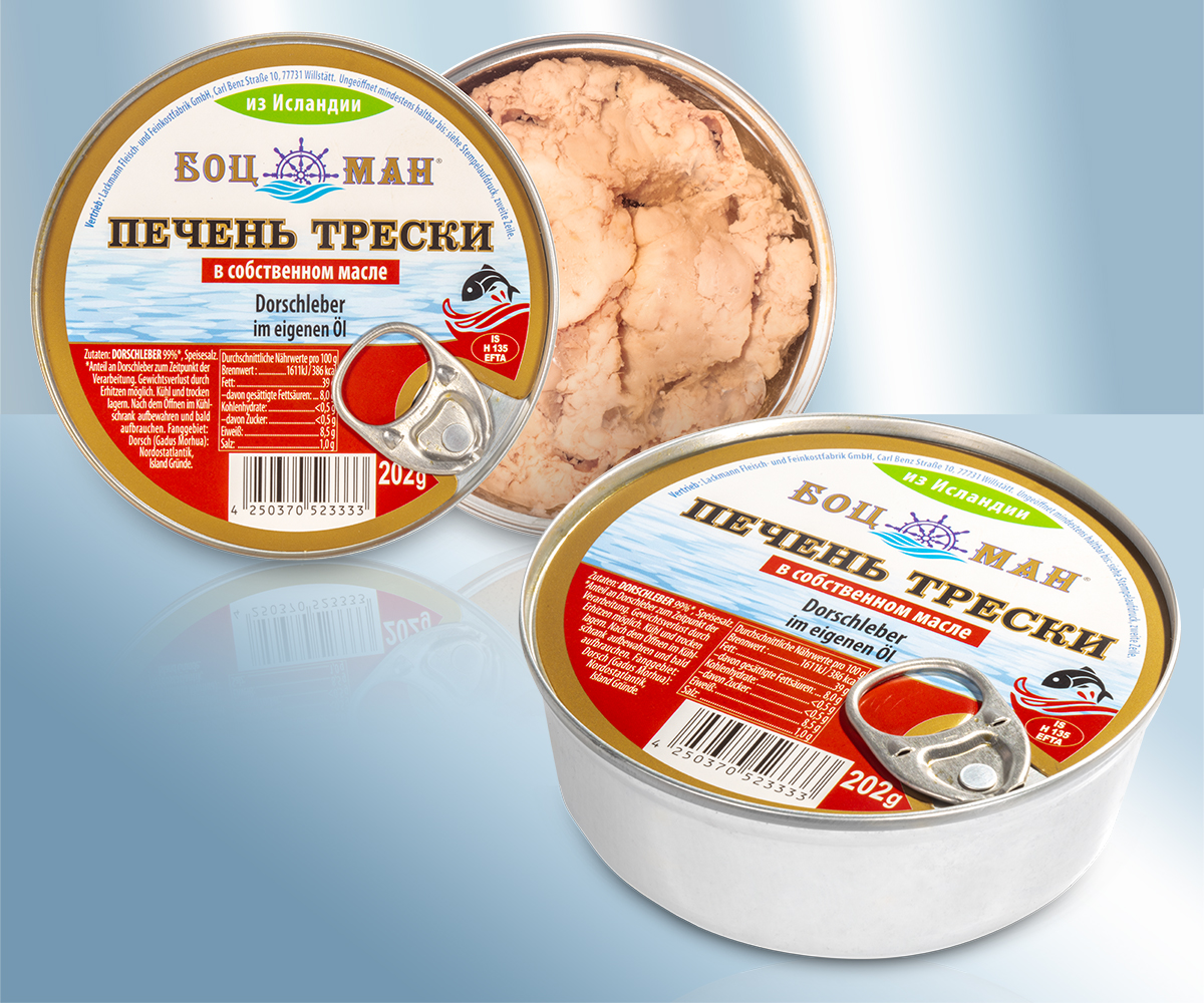печень трески в собственном соку и масле. . Район рыбного промысла: треска (Gadus Morhua): Северо-Восточная Атлантика (FAO 27.5), Шельф Исландии. Метод улова: крючки и донные крючковые снасти и/или кошельковые неводы и/или жаберные сети и аналогичные сети. Состав: печень трески 99%*, пищевая соль. *Доля содержания печени трески в момент перерабтки. При нагревании возможно уменьшение веса. Хранить в сухом прохладном месте. После вскрытия упаковки хранить в холодильнике и употребить в кратчайшие сроки. Сбыт: Lackmann Fleisch- und Feinkostfabrik GmbH, Carl Benz Straße 10, 77731 Willstätt, Германия. Минимальный срок хранения в закрытом виде составляет до: см. оттиск, вторая строка. Пищевая ценность на 100g: Энергетическая ценность: 1611 kJ / 386 kcal, Жиры: 39g, - из них насыщенных жирных кислот: 8,0g, Углеводы: <0,5g, - из них сахара: <0,5g, Белки: 8,5g, Соль: 1,0g,