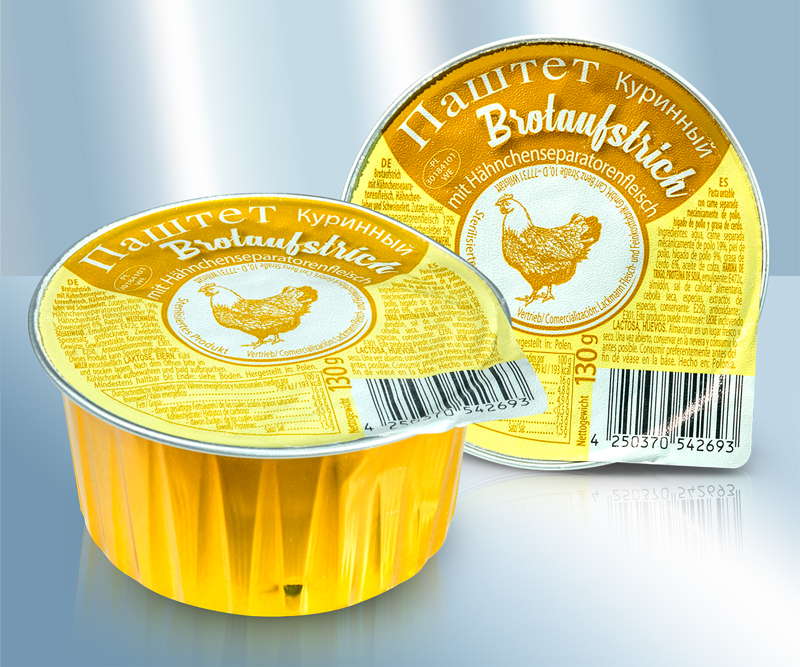 Паста для бутербродов С куриным мясом механической обвалки, Куриная печень и свиной жир.. Состав: вода, Куриное мясо механической обвалки 19%, Куриная кожа, Куриная печень 9%, свиной жир 6%, рапсовое масло, пшеничная мука, соевый белок, Эмульгатор: (E472c), крахмал, пищевая соль, сушёный лук, cпеции, экстракты специй, консервирующее вещество: (E250), антиоксиданты: (E301). Данный продукт может содержать следы: молоко, лактоза, Яйца. Хранить в сухом прохладном месте. После вскрытия упаковки хранить в холодильнике и употребить в кратчайшие сроки. Употребить до конца см. дно. Сбыт: Lackmann Fleisch- und Feinkostfabrik GmbH, Carl Benz Straße 10, 77731 Willstätt, Германия. Пищевая ценность на 100g: Энергетическая ценность: 799 kJ / 193 kcal, Жиры: 16g, - из них насыщенных жирных кислот: 4,8g, Углеводы: 4,9g, - из них сахара: <0,5g, Белки: 7,3g, Соль: 1,5g,