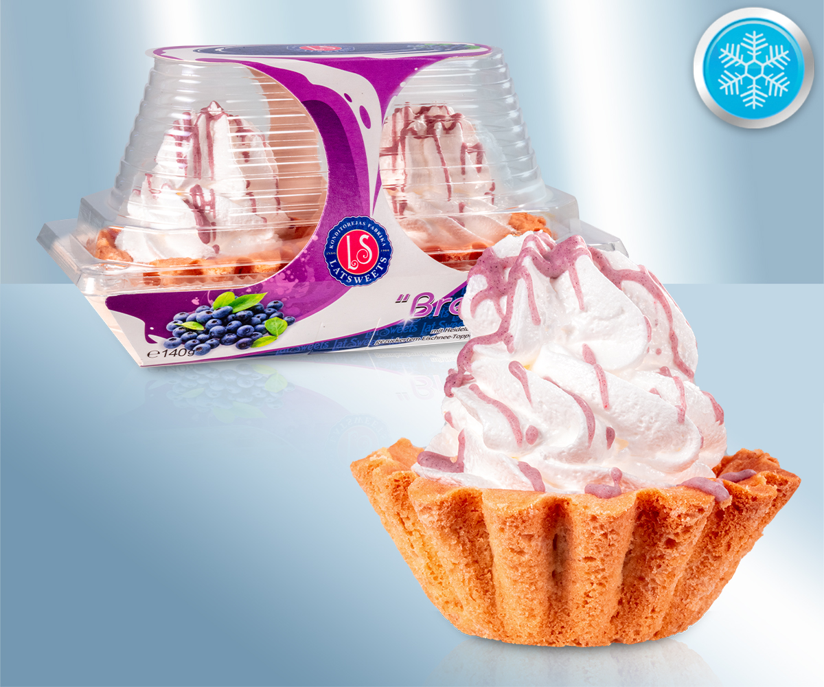 Mини-торты с безе с сахарной пудрой (45%) и с полуфабрикатом из голубики (21%), замороженные. черника: 12% относится к всей продукции. Состав: сахар, пшеничная мука, полуфабрикат из голубики (черника, вода, сахар, модифицированный крахмал, глюкозно-фруктозный сироп, pегулятор кислотности (E330), консервирующее вещество (E202), натуральный ароматизатор), белок куриного яйца, масло сливочное, маргарин (растительные жиры и масла (пальма, рапс), вода, Эмульгатор (E471, E322), пищевая соль, Краситель (E160a), ароматизатор), цельное куриное яйцо, крем с содержанием молока (сахар, пальмоядровое жир полностью гидрогенизированные, сухое обезжиренное молоко, лактоза, Эмульгатор (лецитин (соя)), ароматизатор), pегулятор кислотности (E330), Разрыхлитель теста (E500), Уксус из уксусной кислоты, Краситель (E120, E133). Размороженный продукт не замораживать повторно. Употребить сразу после размораживания. Сбыт: Lackmann Fleisch- und Feinkostfabrik GmbH, Carl Benz Straße 10, 77731 Willstätt, Германия. Срок хранения при ≤ -18 °C до: (номер партии): см. оттиск, белое поле. Пищевая ценность на 100g: Энергетическая ценность: 1541 kJ / 346 kcal, Жиры: 11g, - из них насыщенных жирных кислот: 6,0g, Углеводы: 58g, - из них сахара: 43g, Белки: 4,3g, Соль: 0,23g,