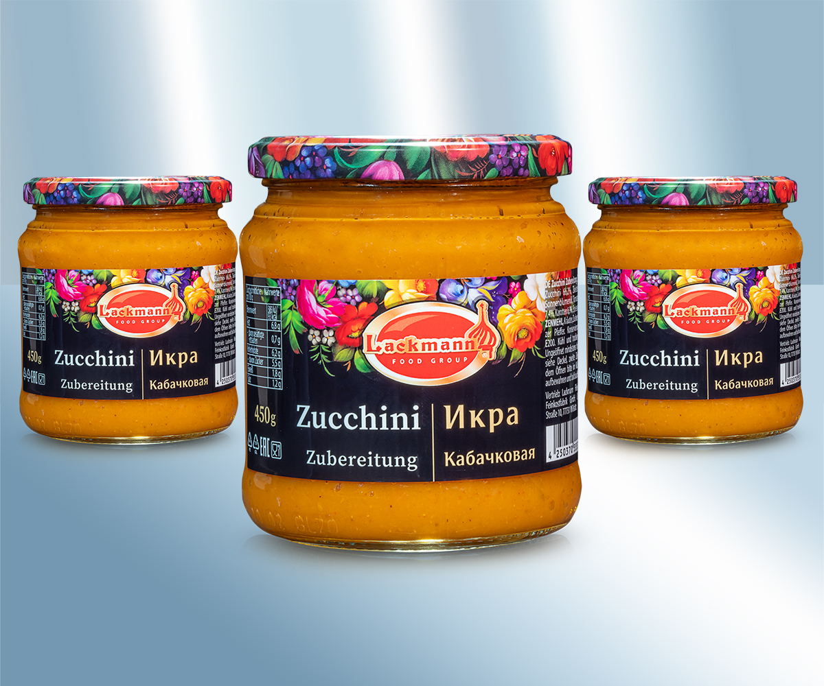 Консервированные цукини. . Состав: цукини 66,2%, лук 10%, подсолнечное масло, мякоть томатов 7,4%, морковь 6,9%, пищевая соль, пшеничная мука, травы, сахар, черный перец. консервирующее вещество: E200. Хранить в сухом прохладном месте. Минимальный срок хранения в закрытом виде составляет до: см. крышку, вторая строка. После вскрытия упаковки хранить в холодильнике и употребить в кратчайшие сроки. Сбыт: Lackmann Fleisch- und Feinkostfabrik GmbH, Carl Benz Straße 10, 77731 Willstätt, Германия. Пищевая ценность на 100g: Энергетическая ценность: 389 kJ / 93 kcal, Жиры: 6,8g, - из них насыщенных жирных кислот: 0,7g, Углеводы: 6,2g, - из них сахара: 5,5g, Белки: 1,8g, Соль: 1,2g,