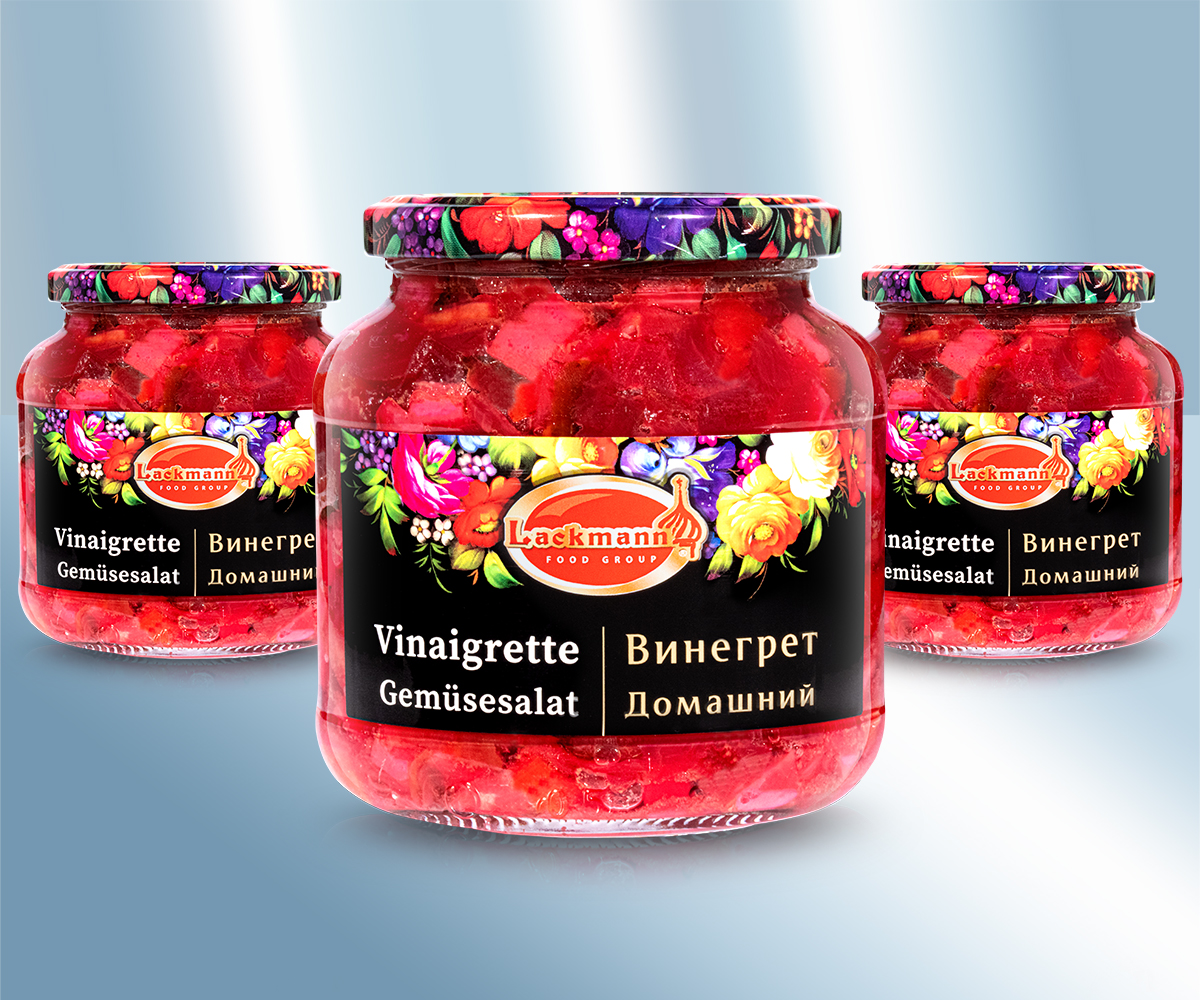 Салат "Винегрет". Состав: капуста белокочанная ферментированный, Консервированные огурцы, свекла, картофель, морковь, лук, подсолнечное масло, поваренная соль, pегулятор кислотности: (уксусная кислота). Хранить в сухом прохладном месте. Минимальный срок хранения в закрытом виде составляет до: см. крышку, вторая строка. После вскрытия упаковки хранить в холодильнике и употребить в кратчайшие сроки. Сбыт: Lackmann Fleisch- und Feinkostfabrik GmbH, Carl Benz Straße 10, 77731 Willstätt, Германия. Пищевая ценность на 100g: Энергетическая ценность: 212 kJ / 50 kcal, Жиры: 3,6g, - из них насыщенных жирных кислот: 0,3g, Углеводы: 3,4g, - из них сахара: 3,1g, Белки: 1,2g, Соль: 1,3g,