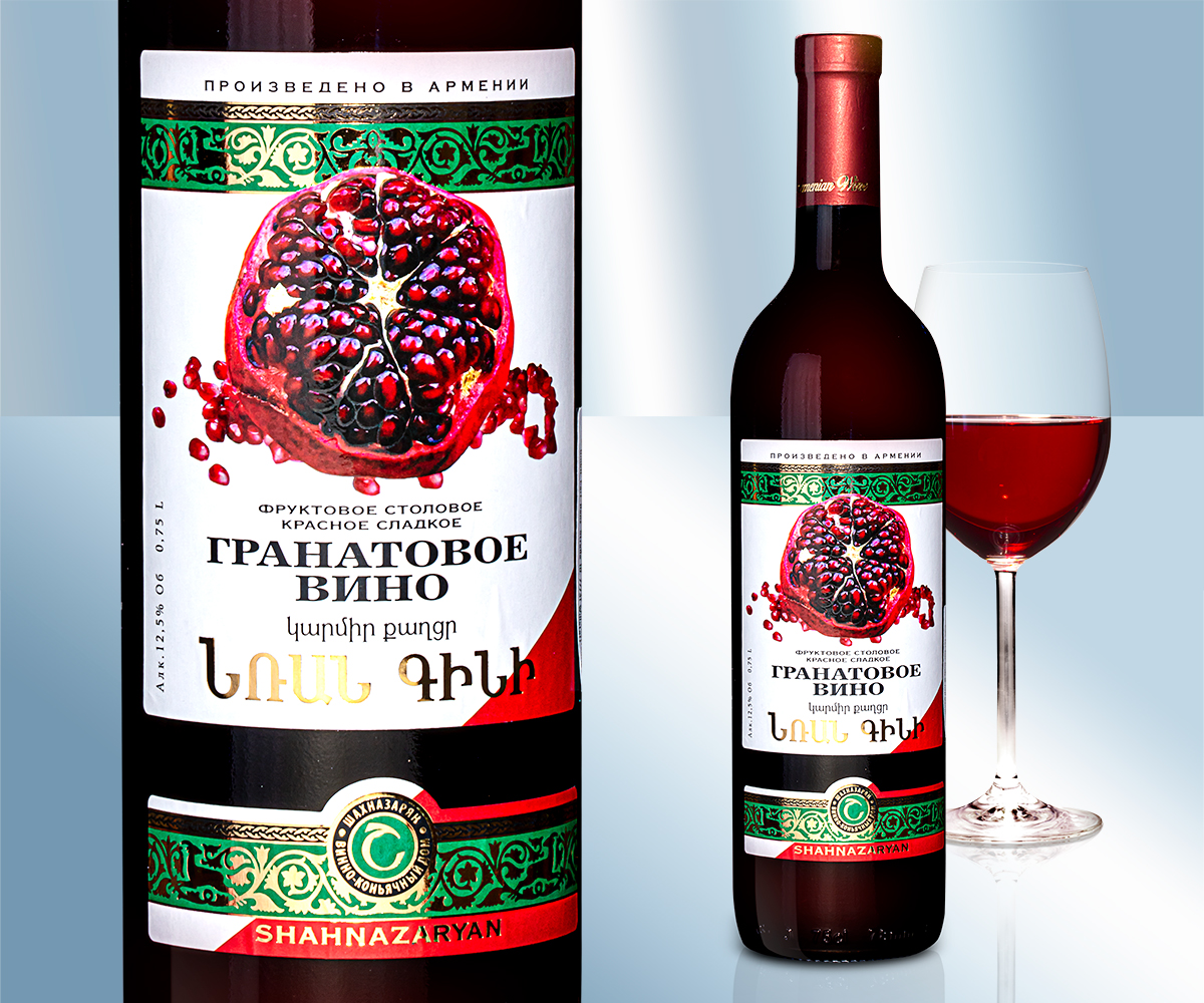 Плодово-ягодное десертное вино из 75% Гранат и 15% яблоки, сладкое. . Alc. 12,5% vol. 0,75L. Содержит сульфиты. Хранить в прохладном, защищенном от света месте. Не рекомендуется употребление беременными женщинами и кормящими матерями, а также детьми до 16 лет. Происхождение: Армения. Импортер: Lackmann Fleisch- und Feinkostfabrik GmbH, Carl-Benz-Straße 10, 77731 Willstätt, Deutschland. Пищевая ценность на 100g: Энергетическая ценность: 461 kJ / 110 kcal, Жиры: 0g, - из них насыщенных жирных кислот: 0g, Углеводы: 9,5g, - из них сахара: 9,1g, Белки: 0g, Соль: 0g,