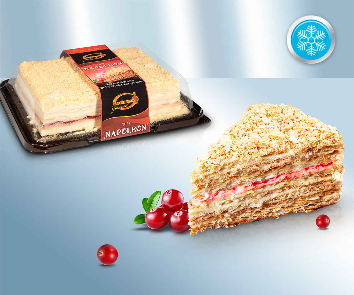 Слоёный торт с ванильным вкусом и с брусничной начинкой, замороженный . Состав: крем: (пахта, растительные жиры и масла: (пальмовое ядро, пальма, кокосовый орех, рапс), полностью гидрогенизированные пальмовое масло, модифицированный крахмал, Эмульгаторы: (E472b, E435, E433), ароматизатор, cтабилизатор: (E407), Краситель: (E160a)), пшеничная мука, вода, кондитерский жир: (растительные жиры и масла: (пальма, рапс), вода, масло сливочное, Эмульгаторы: (E471, E322), пищевая соль, консервирующее вещество: (E200), Краситель: (E160a), ароматизатор), Брусничный наполнитель 6,7%: (сахар, брусничное пюре 44%, модифицированный крахмал, pегулятор кислотности: (E330), загуститель: (E440), консервирующее вещество: (E202)), сахар, красящие пищевые продукты, пищевая соль. Данный продукт может содержать следы: Яйца, Миндаль, Фундук, соевые бобы. Приготовления: Разморозить торт перед подачей на стол. В холодильнике время разморозки составляет около 10 ч. После открытия хранить в холодильнике и использовать в течение 2 дней. Размороженный продукт не замораживать повторно. и Нераскрытый После размораживания хранить при температуре максимум +6 °C 7 дней. Срок хранения при ≤ -18 °C до: см. информацию на упаковке сверху, первая строка. номер партии: см. информацию на упаковке сверху, вторая строка. Сбыт: Lackmann Fleisch- und Feinkostfabrik GmbH, Carl-Benz-Straße 10, 77731 Willstätt, Deutschland. Пищевая ценность на 100g: Энергетическая ценность: 1472 kJ / 354 kcal, Жиры: 24g, - из них насыщенных жирных кислот: 13g, Углеводы: 30g, - из них сахара: 13g, Белки: 4,0g, Соль: 0,40g,